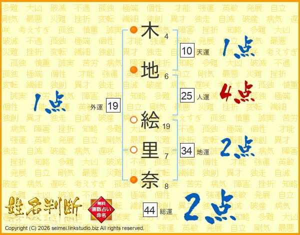 木(4画)地(6画) 絵(19画)里(7画)奈(8画)