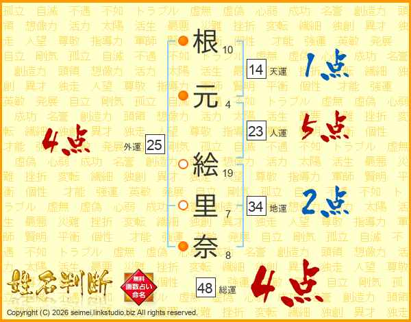 根(10画)元(4画) 絵(19画)里(7画)奈(8画)