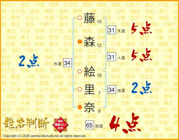 藤森絵里奈さんの総運は65画の4点!