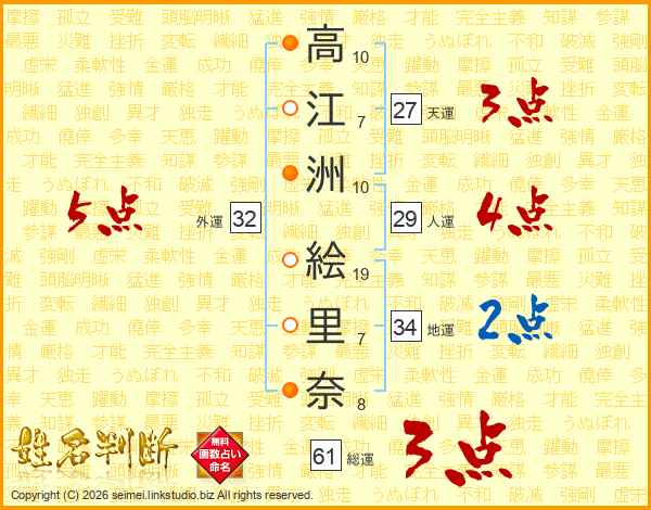 高(10画)江(7画)洲(10画) 絵(19画)里(7画)奈(8画)