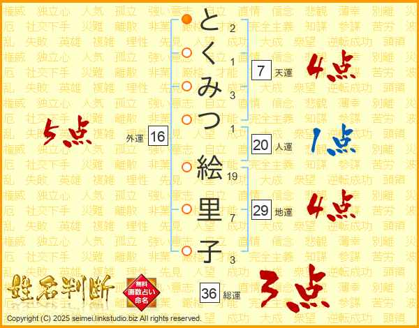 と(2画)く(1画)み(3画)つ(1画) 絵(19画)里(7画)子(3画)