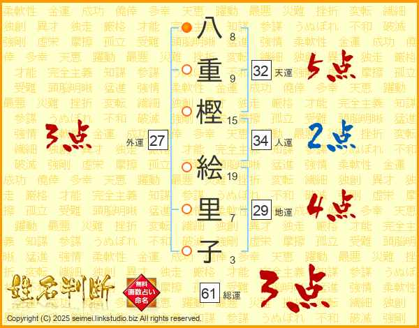 八(8画)重(9画)樫(15画) 絵(19画)里(7画)子(3画)