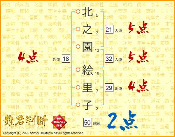 北(5画)之(3画)園(13画) 絵(19画)里(7画)子(3画)