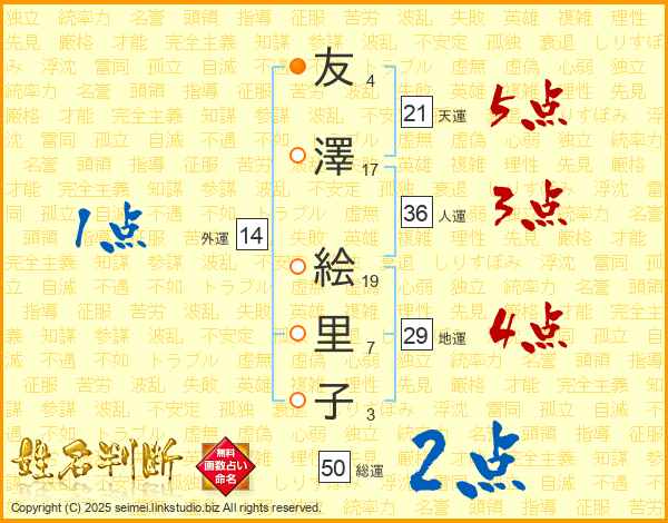 友(4画)澤(17画) 絵(19画)里(7画)子(3画)