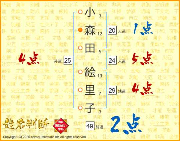 小(3画)森(12画)田(5画) 絵(19画)里(7画)子(3画)