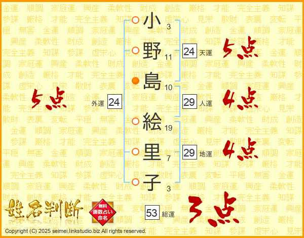 小(3画)野(11画)島(10画) 絵(19画)里(7画)子(3画)