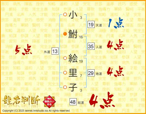 小(3画)鮒(16画) 絵(19画)里(7画)子(3画)
