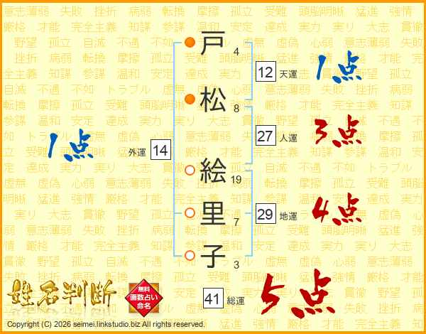 戸(4画)松(8画) 絵(19画)里(7画)子(3画)