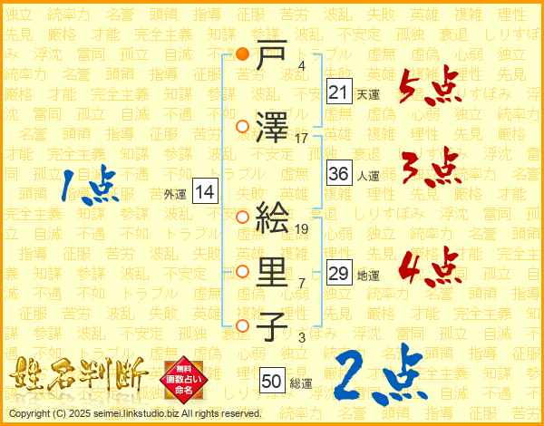 戸(4画)澤(17画) 絵(19画)里(7画)子(3画)
