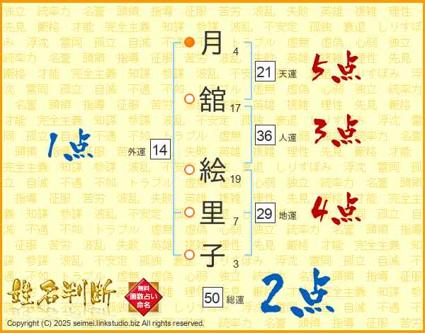 月(4画)舘(17画) 絵(19画)里(7画)子(3画)
