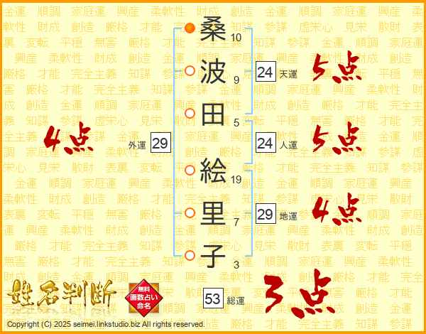 桑(10画)波(9画)田(5画)  絵(19画)里(7画)子(3画)
