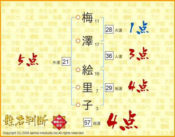 梅(11画)澤(17画) 絵(19画)里(7画)子(3画)