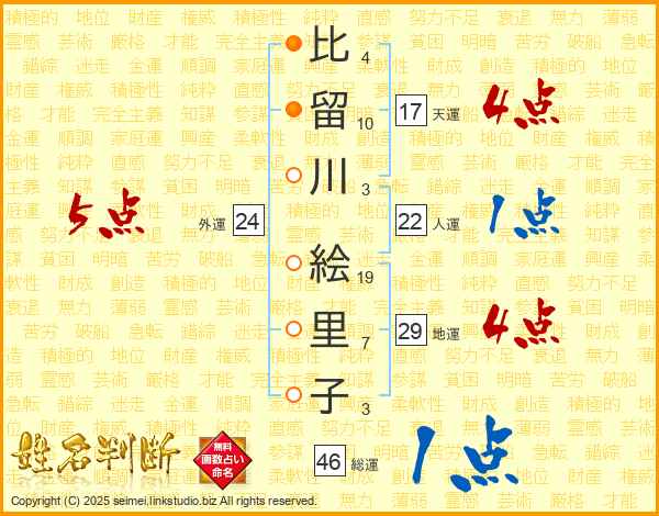 比(4画)留(10画)川(3画) 絵(19画)里(7画)子(3画)