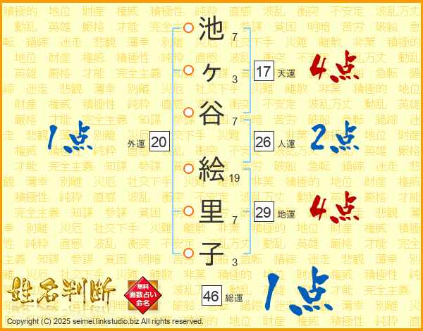 池ヶ谷絵里子さんの総運は46画の1点!