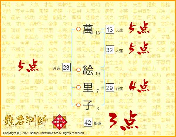 萬(13画) 絵(19画)里(7画)子(3画)
