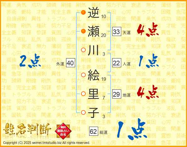 逆瀬川絵里子さんの総運は62画の1点!