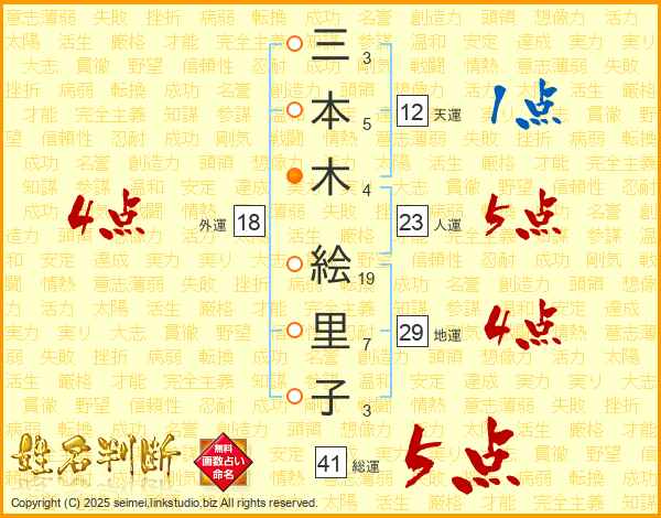 三(3画)本(5画)木(4画) 絵(19画)里(7画)子(3画)