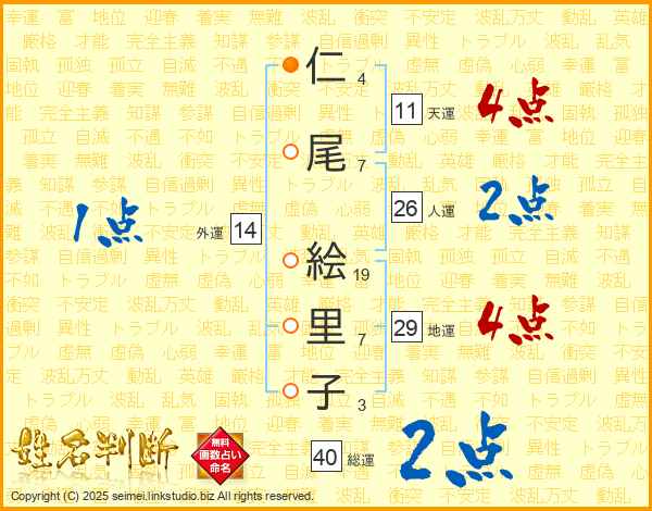 仁(4画)尾(7画) 絵(19画)里(7画)子(3画)