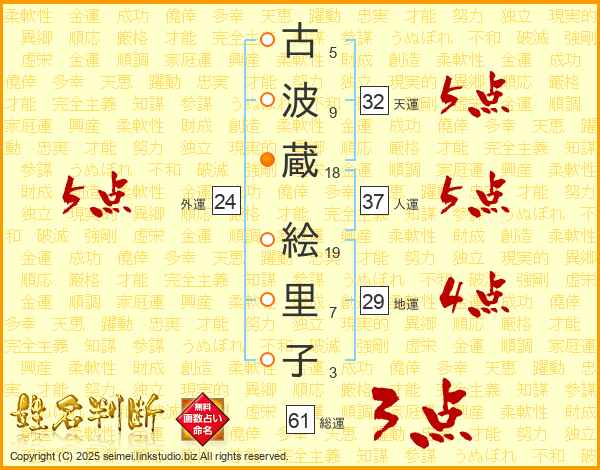 古(5画)波(9画)蔵(18画) 絵(19画)里(7画)子(3画)