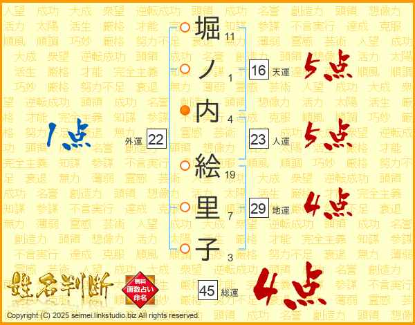 堀(11画)ノ(1画)内(4画) 絵(19画)里(7画)子(3画)