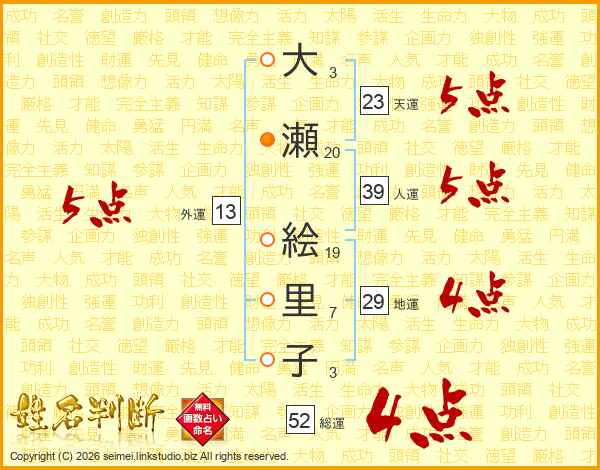 大瀬絵里子さんの総運は52画の4点!