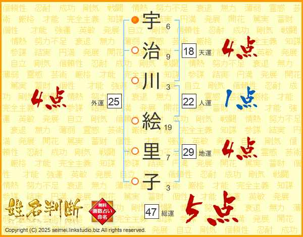 宇(6画)治(9画)川(3画) 絵(19画)里(7画)子(3画)