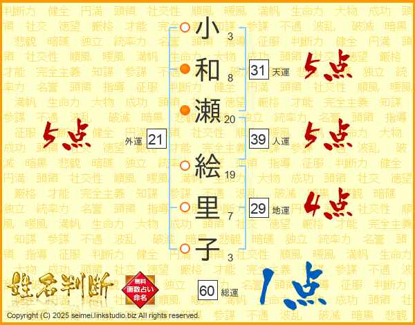小和瀬絵里子さんの人運は39画の5点