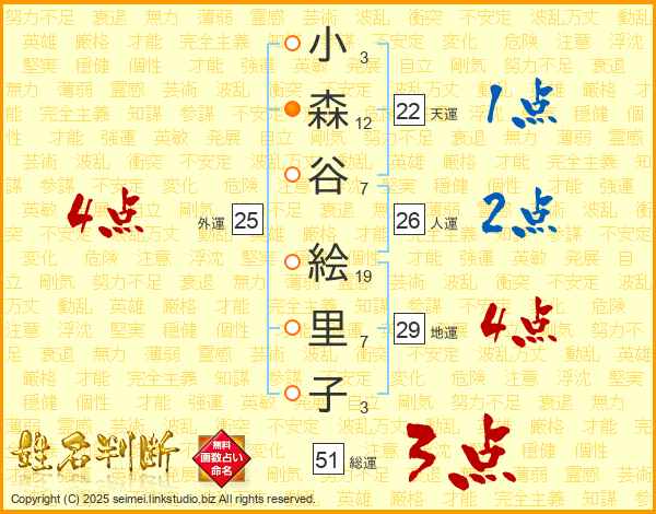 小(3画)森(12画)谷(7画)  絵(19画)里(7画)子(3画)