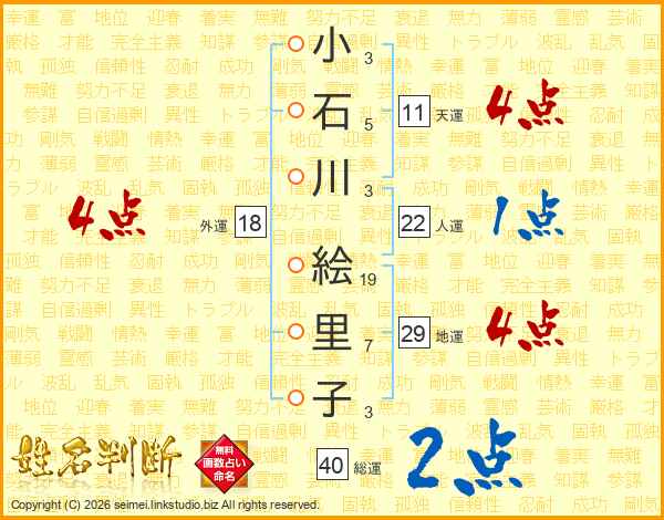 小(3画)石(5画)川(3画) 絵(19画)里(7画)子(3画)