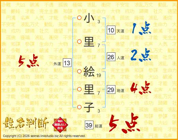 小里絵里子さんの総運は39画の5点!