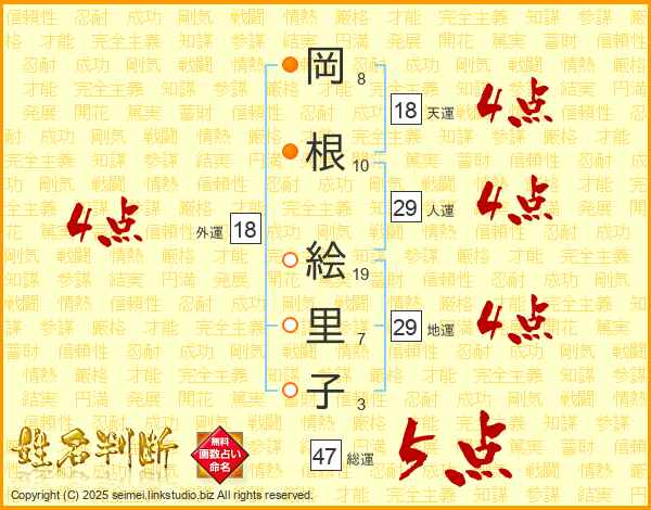 岡(8画)根(10画) 絵(19画)里(7画)子(3画)