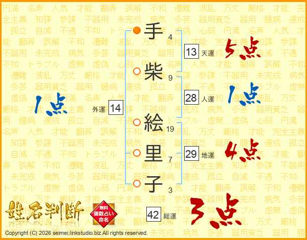 手(4画)柴(9画) 絵(19画)里(7画)子(3画)