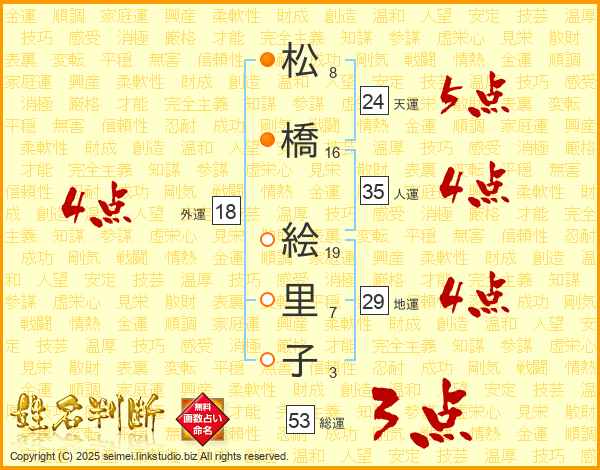 松(8画)橋(16画) 絵(19画)里(7画)子(3画)