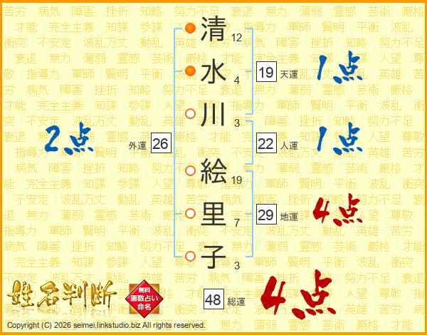 清(12画)水(4画)川(3画) 絵(19画)里(7画)子(3画)