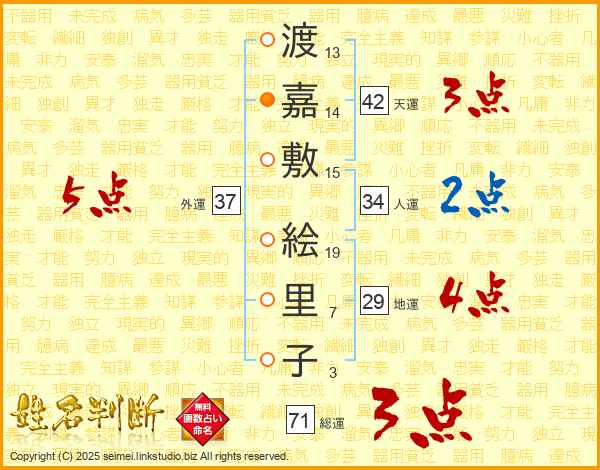 渡(13画)嘉(14画)敷(15画) 絵(19画)里(7画)子(3画)