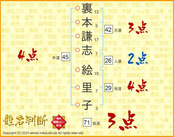 裏(13画)本(5画)謙(17画)志(7画) 絵(19画)里(7画)子(3画)