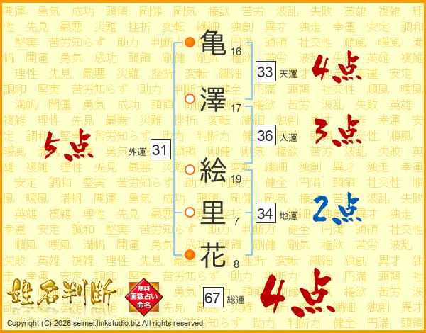 亀(16画)澤(17画) 絵(19画)里(7画)花(8画)