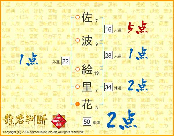 佐(7画)波(9画) 絵(19画)里(7画)花(8画)