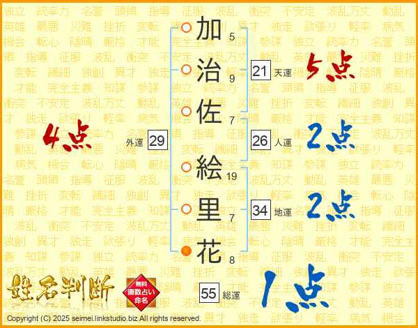 加(5画)治(9画)佐(7画) 絵(19画)里(7画)花(8画)
