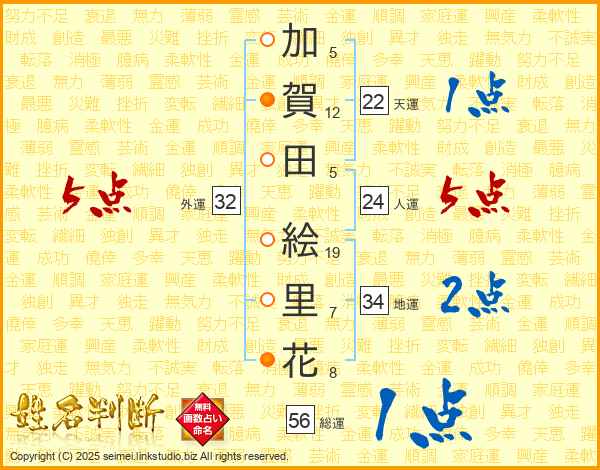 加(5画)賀(12画)田(5画) 絵(19画)里(7画)花(8画)