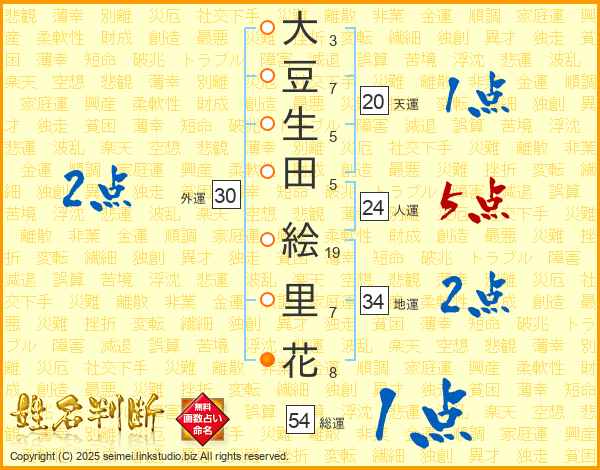 大(3画)豆(7画)生(5画)田(5画) 絵(19画)里(7画)花(8画)