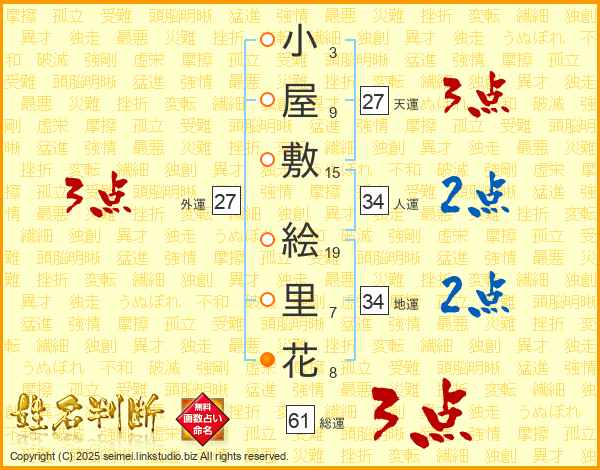 小(3画)屋(9画)敷(15画) 絵(19画)里(7画)花(8画)