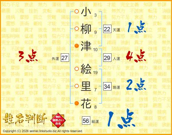小(3画)柳(9画)津(10画) 絵(19画)里(7画)花(8画)