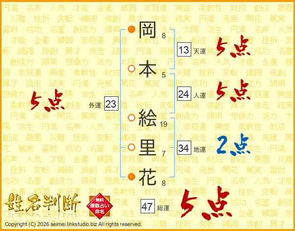 岡(8画)本(5画) 絵(19画)里(7画)花(8画)