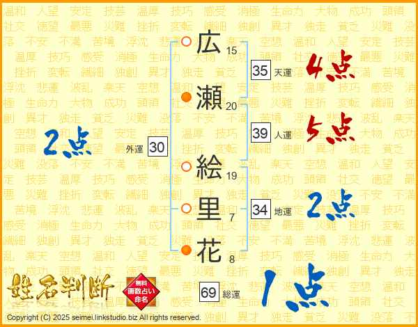 広(15画)瀬(20画) 絵(19画)里(7画)花(8画)