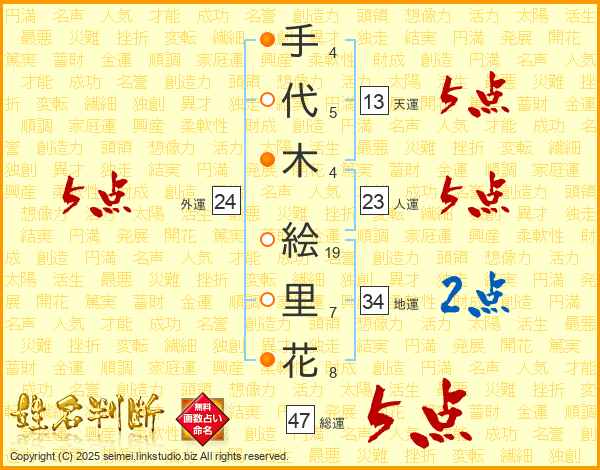 手(4画)代(5画)木(4画) 絵(19画)里(7画)花(8画)