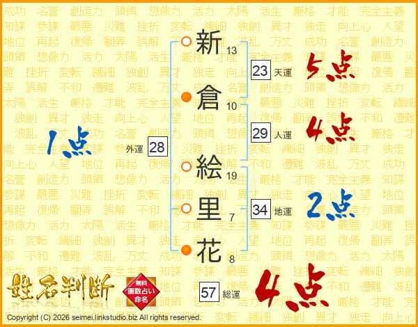 新倉絵里花さんの天運は23画の5点!