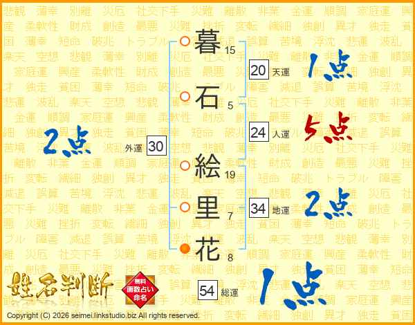 暮(15画)石(5画) 絵(19画)里(7画)花(8画)