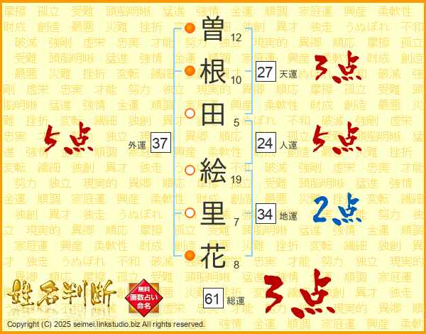 曽(12画)根(10画)田(5画) 絵(19画)里(7画)花(8画)