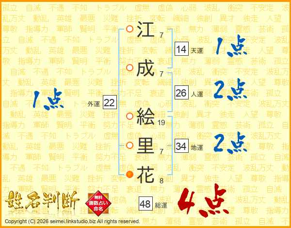 江(7画)成(7画) 絵(19画)里(7画)花(8画)